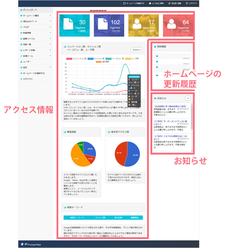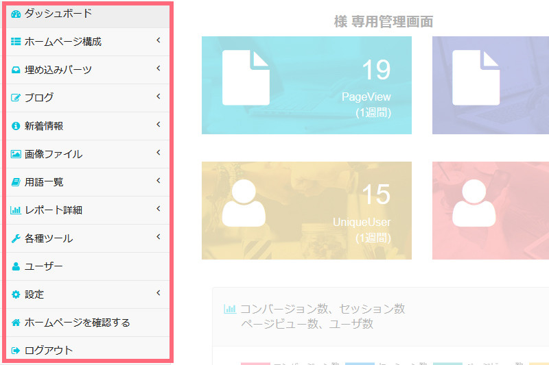 ダッシュボード | 管理画面のトップページ |