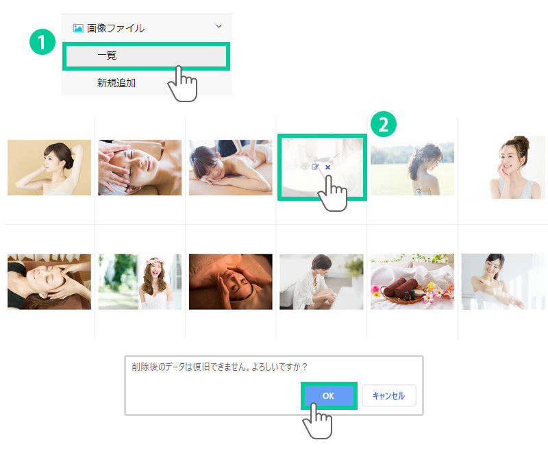 2. 削除したい画像の上にマウスを乗せて右側の「×」を押します。 ※削除するとデータの復旧はできません。