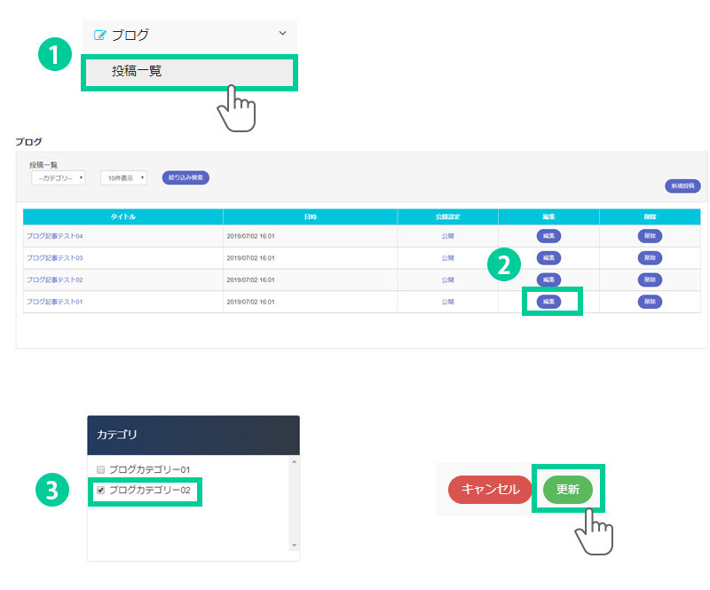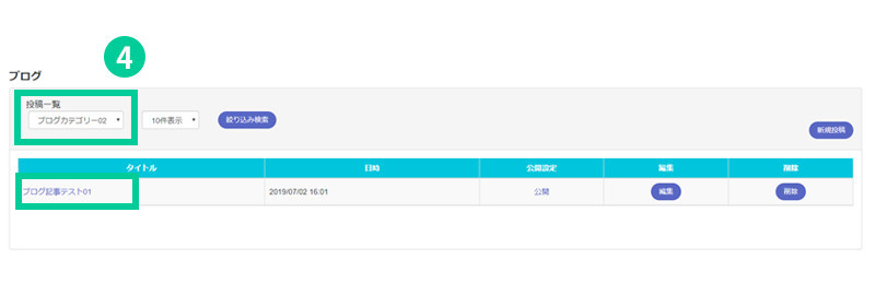 1. メニュー「ブログ> 投稿一覧」をクリックします。