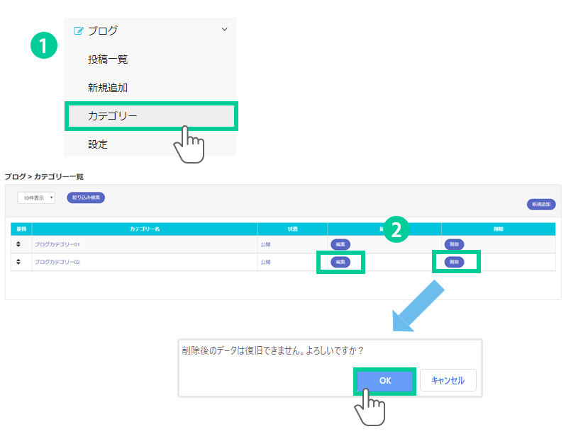 1. メニュー「新着情報>カテゴリー」をクリックします。