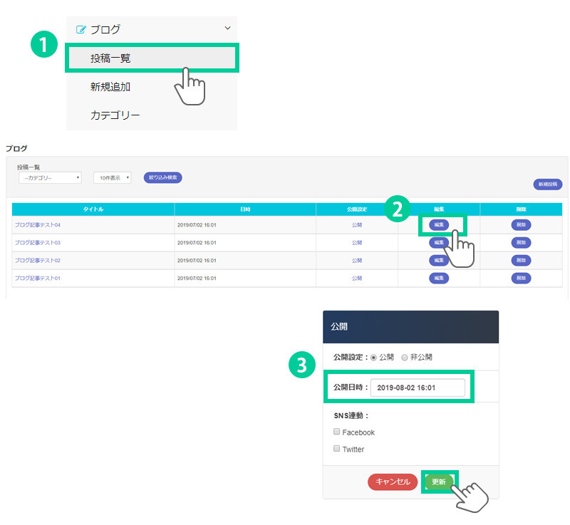 ブログの投稿日時を変更、 または未来の日付を設定して予約投稿をします。