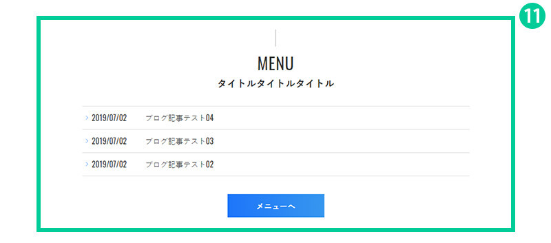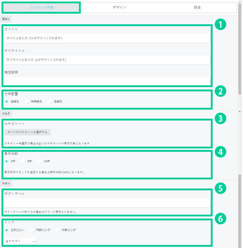 1.コンテンツ内容を設定します。ブログの上に、タイトル・サブタイトル・補足説明の設定が出来ます。