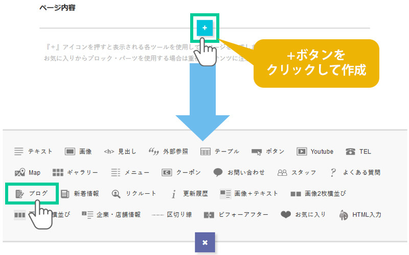 続けてパーツを挿入する場合は「+」をクリックします。 そのまま公開・更新する場合は公開パネルで「更新」をクリックします。