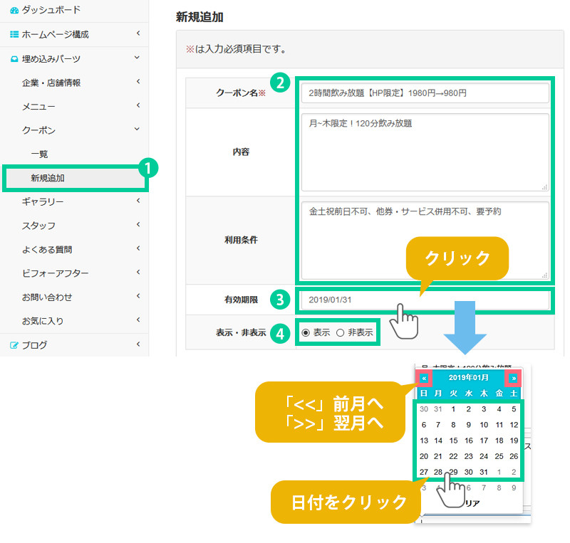 3.有効期限を設定します。 テキストエリアをクリックするとカレンダーが表示されます。 有効期限の日付をクリックします。