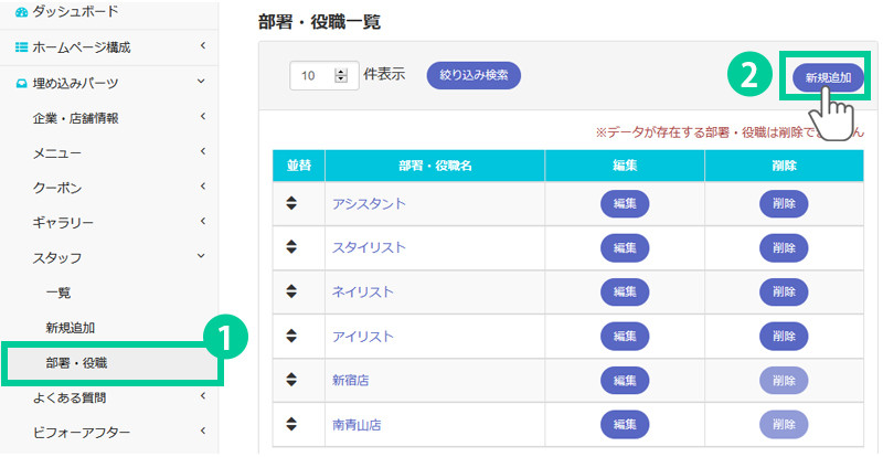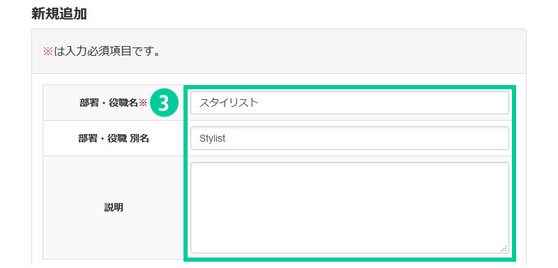 4. 「登録」をクリックします。 新しい部署・役職が追加されます。 部署・役職は複数登録することができます。スタッフの内容に合わせて作成しておきます。 (例1)スタイリスト、アシスタント (例2)営業部、人事部