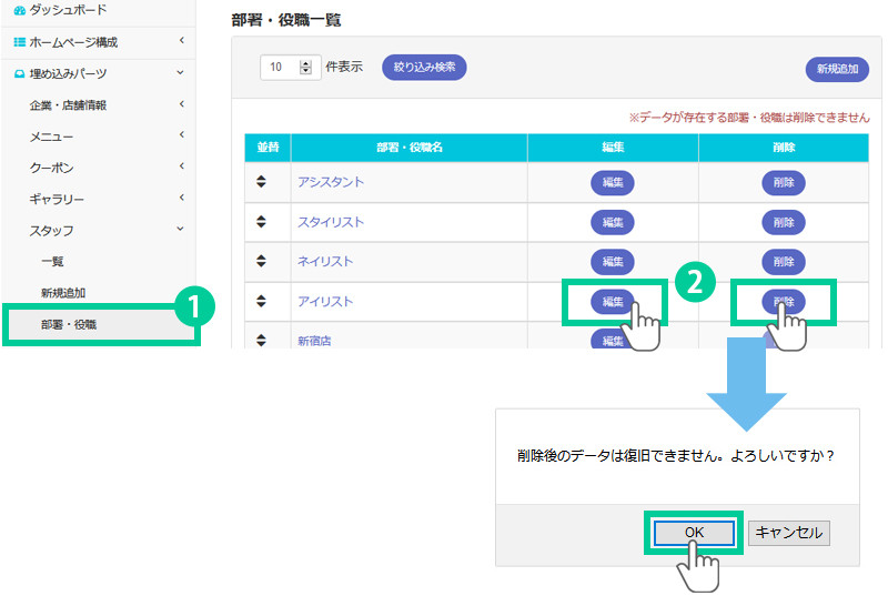 スタッフの 部署・役職 を編集・削除します。