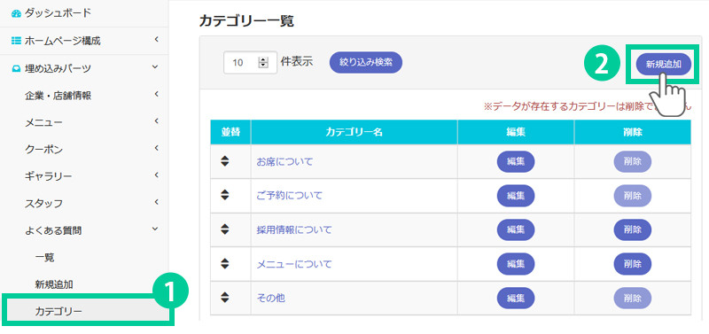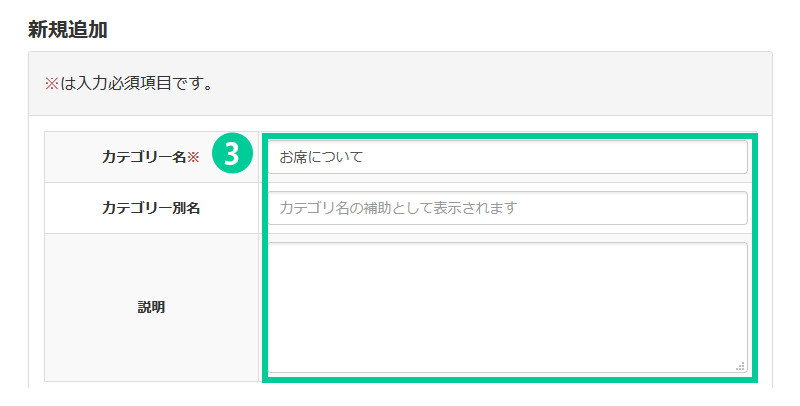 4. 「登録」をクリックします。 新しいカテゴリーが追加されます。 カテゴリーは複数登録することができます。質問の内容に合わせて作成しておきます。 (例)お席について、ご予約について