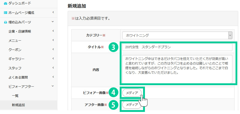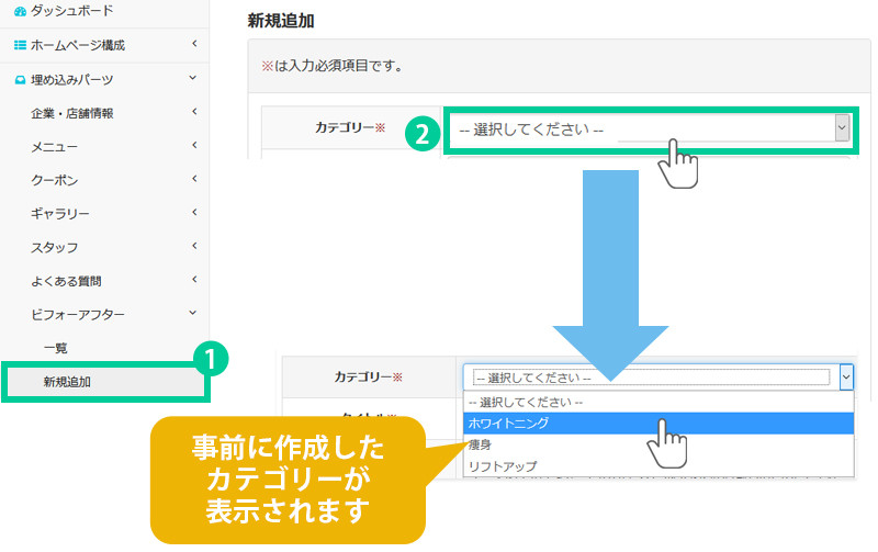 ビフォーアフター を追加する際に、カテゴリー選択が必要になります。
