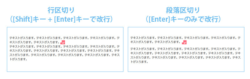 一般的なワープロソフトと同様に、テキスト入力の際に二種類の改行「行区切り(shiftキー + Enterキー)」と「段落区切り(Enterキー)」が存在します。