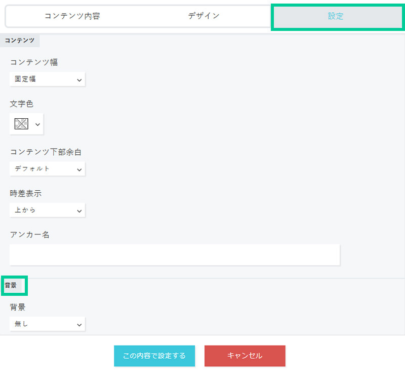 パーツの背景に色や画像を敷きます。 パーツウィジェットの「設定」タブを開きます。