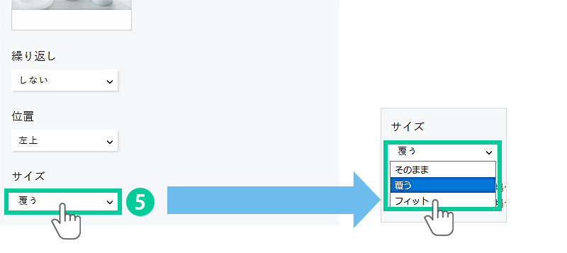 5.サイズを選択します。 背景画像の拡大/縮小方法を指定します。 ⇒そのまま:画像の表示サイズを変更しない ⇒覆う:画像の縦横比を保ったまま、背景の表示エリア全体を覆いつくすサイズに背景画像が拡大/縮小されます。 ⇒フィット:画像の縦横比を保ったまま、背景の表示エリアに合う最小サイズに背景画像が拡大/縮小されます。