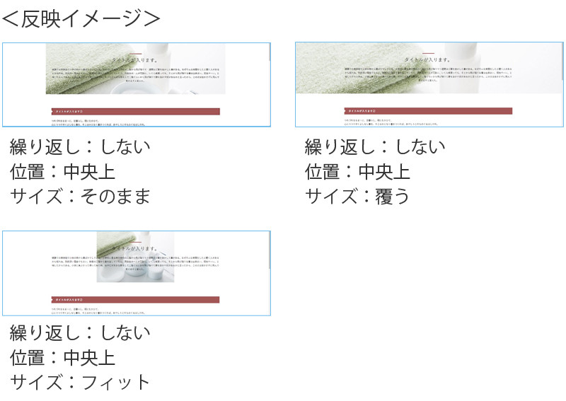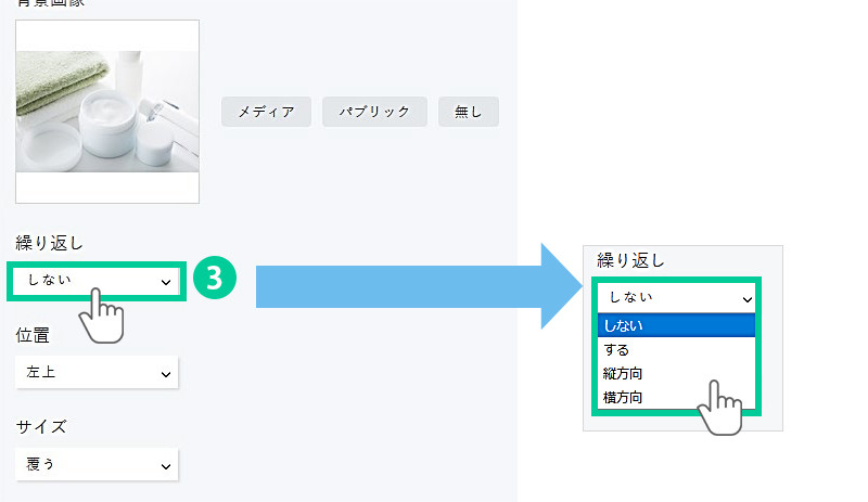 3.繰り返しを選択します。 背景画像をどのように繰り返すかを設定します。 ⇒しない:背景画像は繰り返さない ⇒する:縦方向/横方向ともに繰り返す ⇒縦方向:垂直軸方向だけ繰り返す ⇒横方向:水平軸方向だけ繰り返す