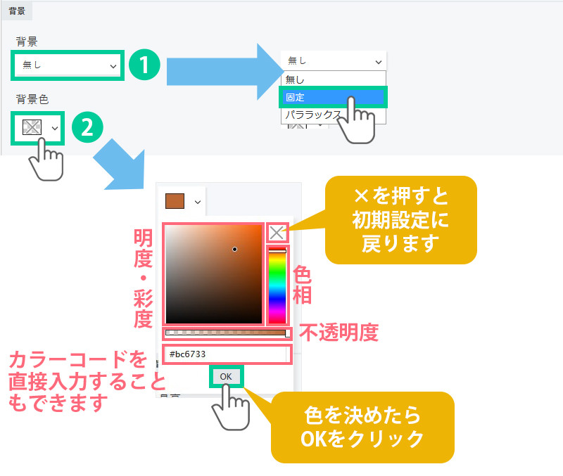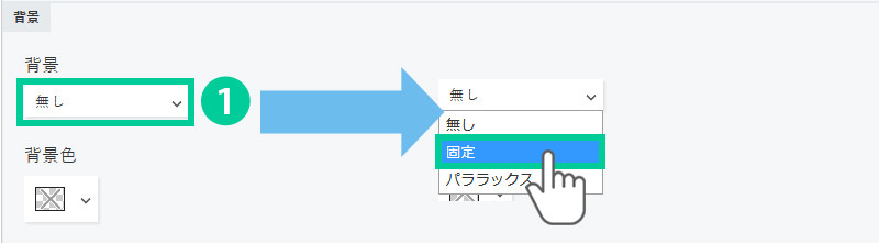 1.背景「固定」か「パララックス」を選択します。 パララックスとは、ページスクロールに応じて視差効果を演出する方法です。