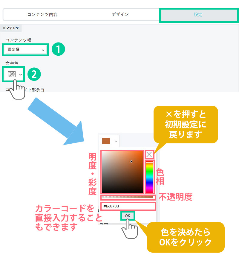 色相・明度・彩度の他に不透明度が選択できます。何も選択しなければ初期設定の色になります。