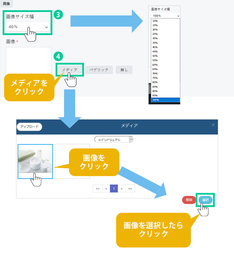 メディアにアップロードしたものもしくは、パブリックから選択します。
