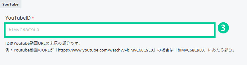 3.YoutubeIDを入力します。 IDはYoutube動画URLの末尾の部分です。 例:Youtube動画のURLが「https://www.youtube.com/watch?v=bIMvC68C9L0」の場合は「bIMvC68C9L0」にあたる部分