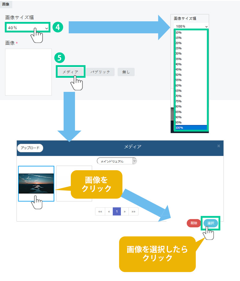 4.画像のサイズ幅を選択します。 コンテンツ幅(⇒「設定」コンテンツ内)に対して10%~100%の中から選択します。