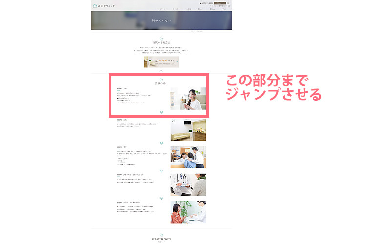 アンカーリンクを設定します。 アンカーとは、ページリンクをさらに細かく指定する場合に使用されます。 ページリンクはそのページの先頭にジャンプするのに対して、アンカーを配置することによりそのページの特定のセクション位置まで指定することができます。