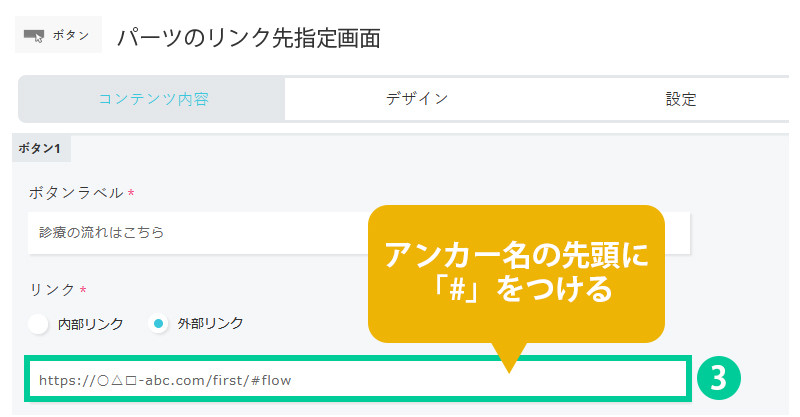 3.リンク元の設定を行います。 例えばボタンパーツを使用する際は、URL入力欄に先ほど設定したリンク先の「アンカー名」を末尾に記述し、その前に「#(ハッシュ)」をつけます。 例:flow→#flow