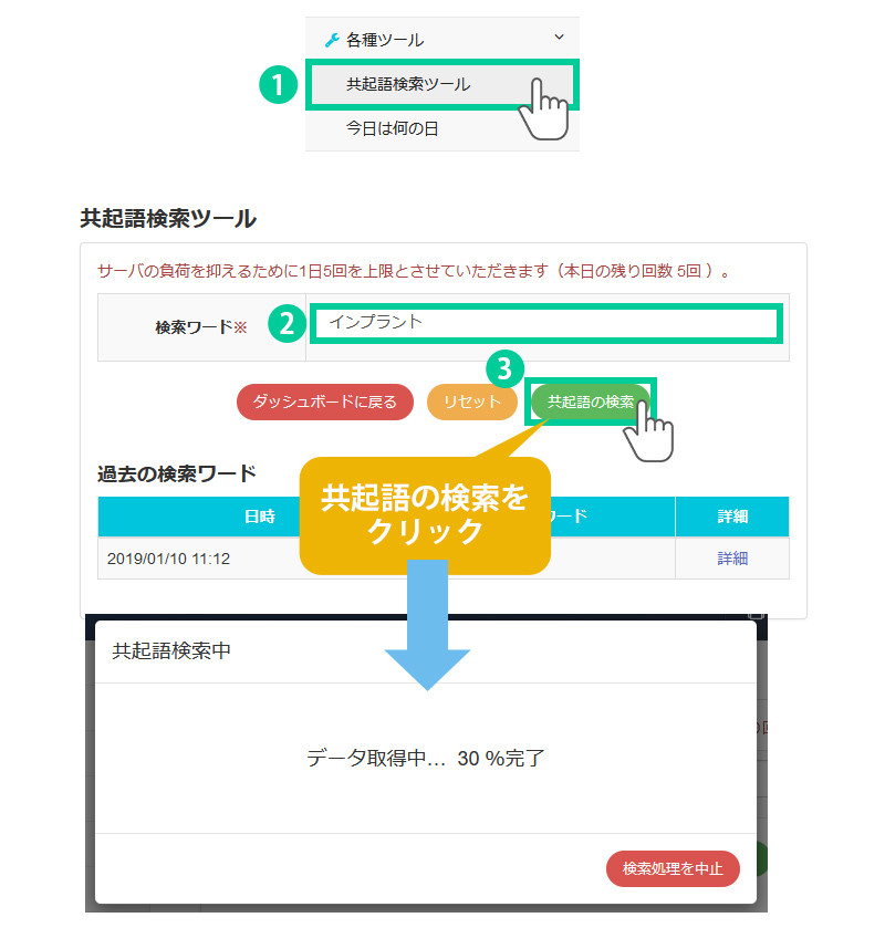 1. メニュー「各種ツール>共起語検索ツール」をクリックします。