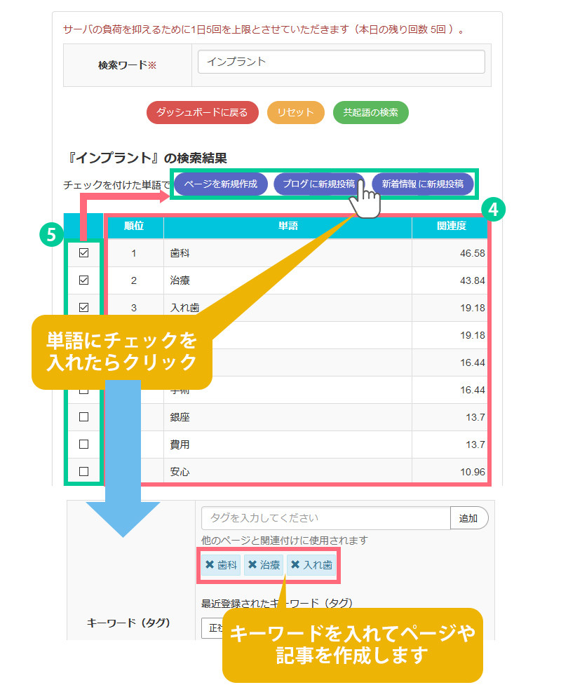 特定キーワードの共起語(そのキーワードと一緒に利用されることが多いキーワード)の一覧を表示します。 この共起語はSEO対策に有効であり、ユーザーの検索意図を盛り込んだWebページを作る際に活用する語句となります。 共起語を含めたページ(ブログ記事)を提供することで、よりSEO効果が期待できるようになるので、最終的に検索順位の上昇が見込めるようになります。 サーバーへ大きな負荷がかかるため、1日5回までに利用回数を制限しています。