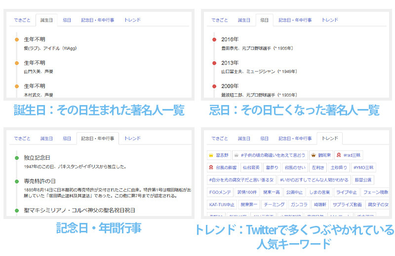2.今日は何の日のできごと一覧が表示されます。 タブを切り替えると、できごと、誕生日、忌日、記念日・年間行事・トレンドを表示することができます。