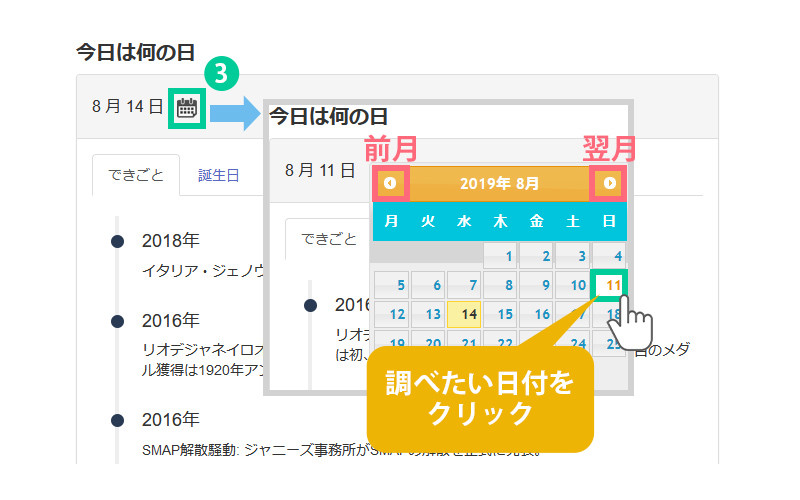 3. カレンダーマークをクリックして日付を変更することで、今日の出来事だけでなく 別の日の情報を表示することも出来ます。