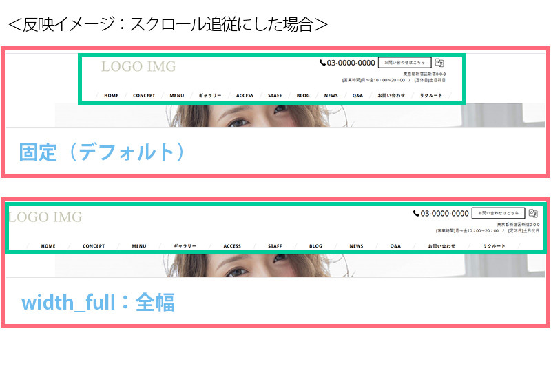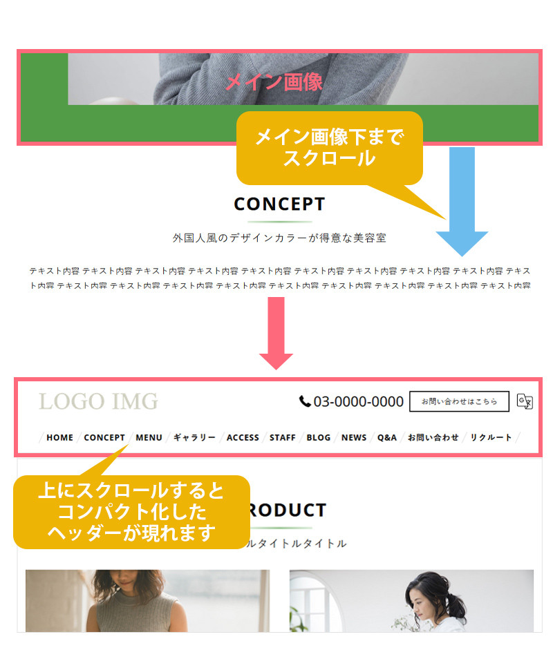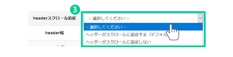 3.headerスクロール追従を選択します。 スクロール追従するに設定すると、メイン画像より下の位置で上方向へ スクロールすると上部からコンパクト化したヘッダーが出現します。